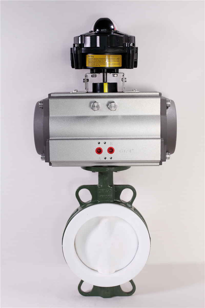 軼博羅襯氟氣動蝶閥采用帶有球形密封表面的襯聚四氟乙烯包襯蝶板,襯氟氣動蝶閥操作輕便,嚴密的密封性能,超長的使用壽命;可作快速切斷或調節流量之用。襯氟氣動蝶閥適用于要求可靠密封和良好調節特性的場合。閥體采用分體式,閥軸兩端的密封由蝶板與閥座 之間的旋轉基面加氟橡膠來控制;保證閥軸不與腔內流體介質接觸。廣泛適用于各種不同類型工業管道中液體和氣體(包括蒸氣)的輸送,有嚴重腐蝕性介質的使用場合,如:硫酸、氫氟酸、磷酸、氯氣、強堿、王水等具有強腐蝕性的介質。